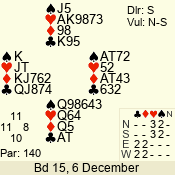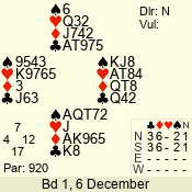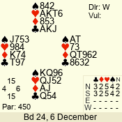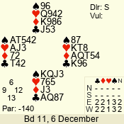| 3 NT | S | +1 | 430 | 2 | 11 - 12 | 4 | 7 |