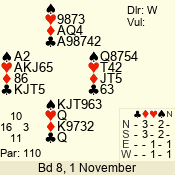 | 3 NT | W | +1 | -430 | 8 | 02 - 04 | 9 | 6 |