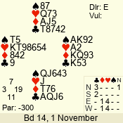 | 3 NT | S | +1 | 430 | 4 | 14 - 13 | 12 | 5 |