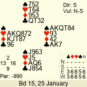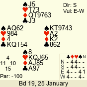 | 3 NT | S | +1 | 430 | 6 | 12 - 12 | 1 | 12 |