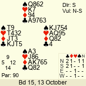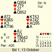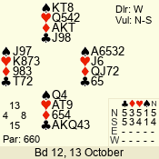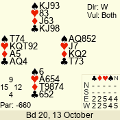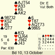 | Con | Dc | Res | Score | Ld | Pairs | Rd | Tbl | | 3 N | S | = | 600 | K | 10 - 10 | 1 | 10 |