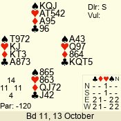 | Con | Dc | Res | Score | Ld | Pairs | Rd | Tbl | | 2 N | W | = | -120 | 4 | 06 - 10 | 7 | 6 |