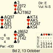 | Con | Dc | Res | Score | Ld | Pairs | Rd | Tbl | | 3 N | N | +1 | 430 | 6 | 01 - 02 | 10 | 1 |