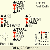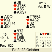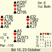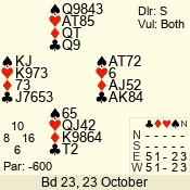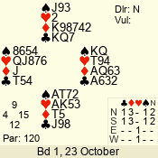 | Con | Dc | Res | Score | Ld | Pairs | Rd | Tbl | | 1 N | W | +1 | -120 | J | 04 - 07 | 6 | 4 |