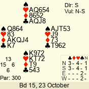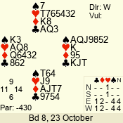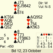 | Con | Dc | Res | Score | Ld | Pairs | Rd | Tbl | | 3 N | S | +1 | 430 | 2 | 04 - 03 | 2 | 4 |