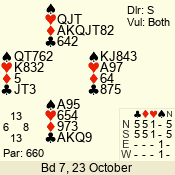 | Con | Dc | Res | Score | Ld | Pairs | Rd | Tbl | | 3 N | N | +2 | 660 | 2 | 01 - 03 | 7 | 1 |