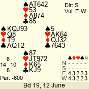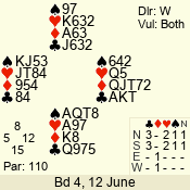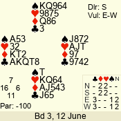 | Con | Dc | Res | Score | Ld | Pairs | Rd | Tbl | | 3 N | E | -3 | 300 | J | 08 - 06 | 3 | 8 |