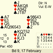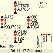 | Con | Dc | Res | Score | Ld | Pairs | Rd | Tbl | | 3 N | S | = | 400 | Q | 04 - 06 | 8 | 4 |