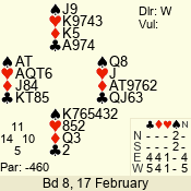 | Con | Dc | Res | Score | Ld | Pairs | Rd | Tbl | | 3 N | N | = | 400 | 2 | 09 - 08 | 2 | 9 |