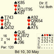 | Con | Dc | Res | Score | Ld | Pairs | Rd | Tbl | | 3 NT | E | -2 | 200 | 3 | 04 - 10 | 12 | 4 |