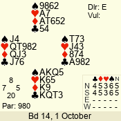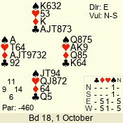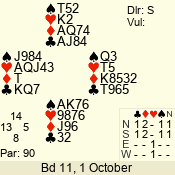 | 3 NT | S | +2 | 460 | Q | 14 - 11 | 11 | 1 |