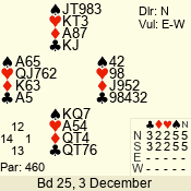 | Con | Dc | Res | Score | Ld | Pairs | Rd | Tbl | | 3 NT | N | +2 | 460 | T | 01 - 03 | 8 | 1 |