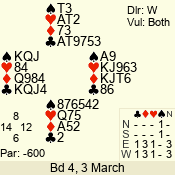 | 3 NT | W | +1 | -630 | 3 | 04 - 04 | 12 | 4 |