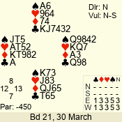 | Con | Dc | Res | Score | Ld | Pairs | Rd | Tbl | | 3 N | S | +2 | 460 | 2 | 01 - 11 | 6 | 1 |