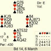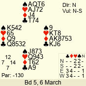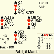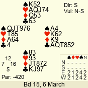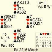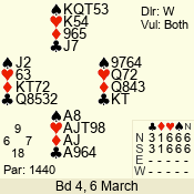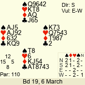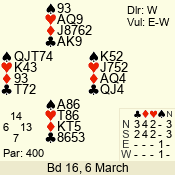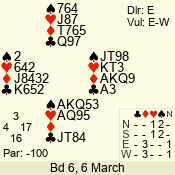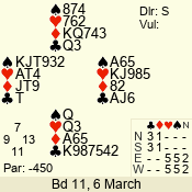 | 3 NT | W | +2 | -660 | Q | 10 - 11 | 12 | 10 |