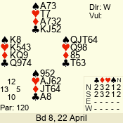 | Con | Dc | Res | Score | Ld | Pairs | Rd | Tbl | | 3 N | S | +1 | 430 | 5 | 04 - 07 | 7 | 4 |