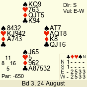 Con | Dc | Res | Score | Ld | Pairs | Rd | Tbl | 3 NT | W | -2 | 200 | 3 | 03 - 09 | 11 | 3 |