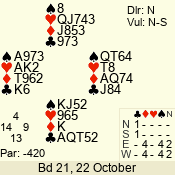 | Con | Dc | Res | Score | Ld | Pairs | Rd | Tbl | | 3 N | E | -3 | 150 | K | 05 - 04 | 2 | 5 |