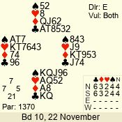 | 3 NT | E | +1 | -630 | 2 | 10 - 05 | 6 | 10 |