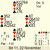 | Con | Dc | Res | Score | Ld | Pairs | Rd | Tbl | | 1 NT | S | +2 | 150 | 3 | 11 - 08 | 4 | 11 |