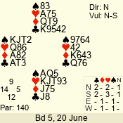 | Con | Dc | Res | Score | Ld | Pairs | Rd | Tbl | | 3 N | S | = | 600 | 3 | 05 - 07 | 9 | 5 |