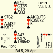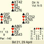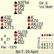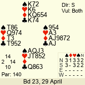 | Con | Dc | Res | Score | Ld | Pairs | Rd | Tbl | | 3 N | S | +3 | 690 | Q | 05 - 07 | 7 | 5 |