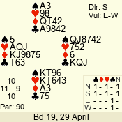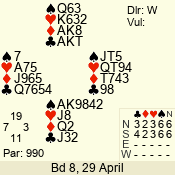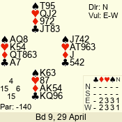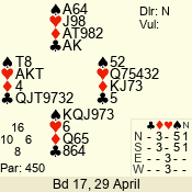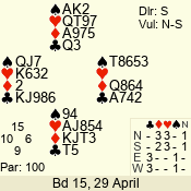 | Con | Dc | Res | Score | Ld | Pairs | Rd | Tbl | | 3 N | S | +3 | 690 | Q | 05 - 07 | 7 | 5 |