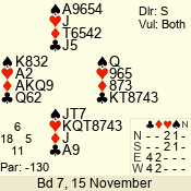 | Con | Dc | Res | Score | Ld | Pairs | Rd | Tbl | | 3 NT | S | +1 | 430 | 7 | 12 - 05 | 8 | 6 |