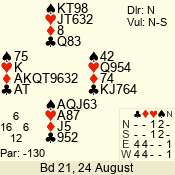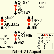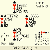 | Con | Dc | Res | Score | Ld | Pairs | Rd | Tbl | | 3 N | E | -2 | 200 | 5 | 05 - 05 | 1 | 5 |