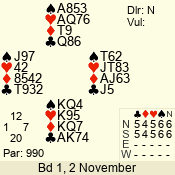 | Con | Dc | Res | Score | Ld | Pairs | Rd | Tbl | | 6 NT | N | = | 990 | A | 03 - 06 | 4 | 4 |