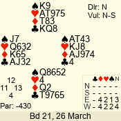 | Con | Dc | Res | Score | Ld | Pairs | Rd | Tbl | | 3 N | W | -2 | 100 | K | 01 - 13 | 21 | 1 |