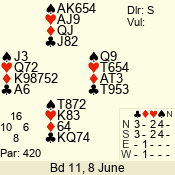 | Con | Dc | Res | Score | Ld | Pairs | Rd | Tbl | | 1 N | N | +2 | 150 | 2 | 01 - 11 | 3 | 1 |