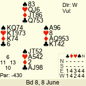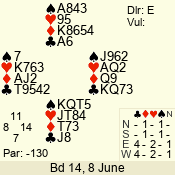 | Con | Dc | Res | Score | Ld | Pairs | Rd | Tbl | | 1 N | N | +2 | 150 | 2 | 08 - 03 | 6 | 8 |