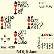 | Con | Dc | Res | Score | Ld | Pairs | Rd | Tbl | | 6 N | E | -1 | 50 | 2 | 03 - 09 | 7 | 3 |