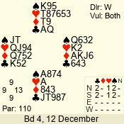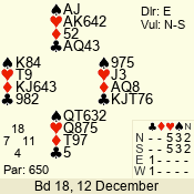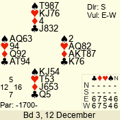 | 3 NT | S | +1 | 430 | 6 | 10 - 11 | 12 | 10 |