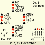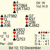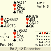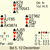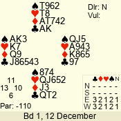 | 3 NT | S | +1 | 430 | 6 | 10 - 11 | 12 | 10 |