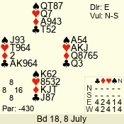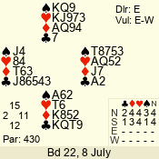 | Con | Dc | Res | Score | Ld | Pairs | Rd | Tbl | | 3 N | S | +1 | 430 | 5 | 01 - 05 | 8 | 1 |