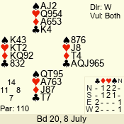 | Con | Dc | Res | Score | Ld | Pairs | Rd | Tbl | | 3 N | S | +4 | 720 | 9 | 06 - 01 | 4 | 1 |