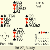 | Con | Dc | Res | Score | Ld | Pairs | Rd | Tbl | | 3 N | S | +2 | 460 | 4 | 01 - 07 | 6 | 2 |