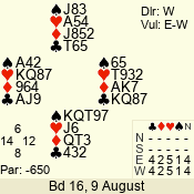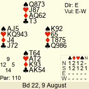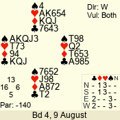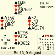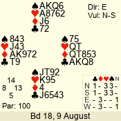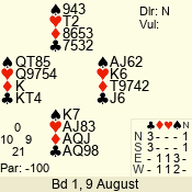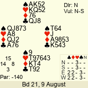 | Con | Dc | Res | Score | Ld | Pairs | Rd | Tbl | | 3 N | W | -1 | 100 | J | 06 - 05 | 2 | 6 |