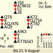 | Con | Dc | Res | Score | Ld | Pairs | Rd | Tbl | | 3 N | S | +3 | 690 | 6 | 05 - 01 | 5 | 5 |