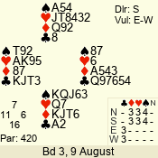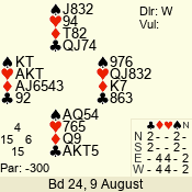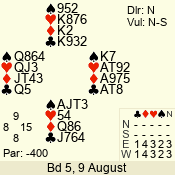 | Con | Dc | Res | Score | Ld | Pairs | Rd | Tbl | | 3 N | S | = | 400 | 5 | 03 - 05 | 5 | 3 |