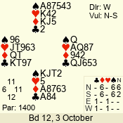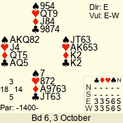 | Con | Dc | Res | Score | Ld | Pairs | Rd | Tbl | | 3 N | N | = | 400 | 6 | 06 - 02 | 5 | 6 |
