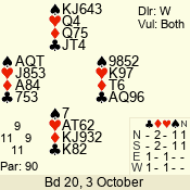 | Con | Dc | Res | Score | Ld | Pairs | Rd | Tbl | | 3 N | S | +3 | 690 | 9 | 04 - 08 | 8 | 4 |