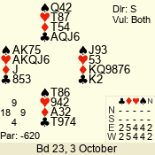 | Con | Dc | Res | Score | Ld | Pairs | Rd | Tbl | | 3 N | E | -1 | 100 | T | 01 - 01 | 12 | 1 |