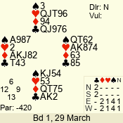 | Con | Dc | Res | Score | Ld | Pairs | Rd | Tbl | | 3 NT | N | = | 400 | 2 | 14 - 12 | 12 | 1 |