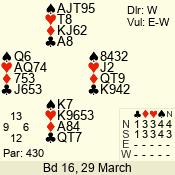 | Con | Dc | Res | Score | Ld | Pairs | Rd | Tbl | | 3 NT | S | +1 | 430 | 7 | 13 - 09 | 11 | 5 |