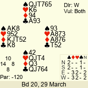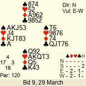 | Con | Dc | Res | Score | Ld | Pairs | Rd | Tbl | | 2 NT | E | = | -120 | 3 | 10 - 06 | 8 | 5 |