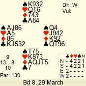 | Con | Dc | Res | Score | Ld | Pairs | Rd | Tbl | | 2 NT | W | -4 | 400 | 5 | 11 - 04 | 7 | 6 |
