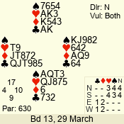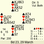 | Con | Dc | Res | Score | Ld | Pairs | Rd | Tbl | | 3 NT | N | = | 400 | 2 | 14 - 12 | 12 | 1 |